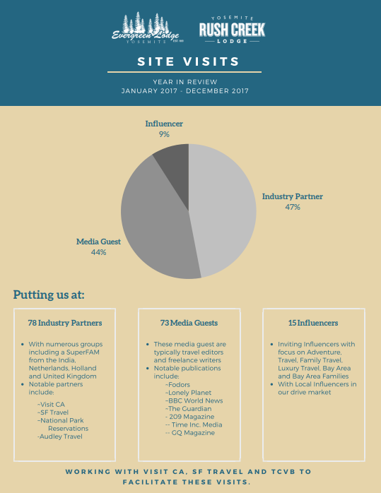 Developing a large network of industry partners was critical for the marketing strategy of the Evergreen Lodge. I worked closely with local destination marketing organizations, like Tuolumne County Visitors Bureau and San Francisco Travel, and broader level organizations, like Visit California and Brand USA, to put together media visits, FAM trips and individual visits as pats of larger media campaigns.